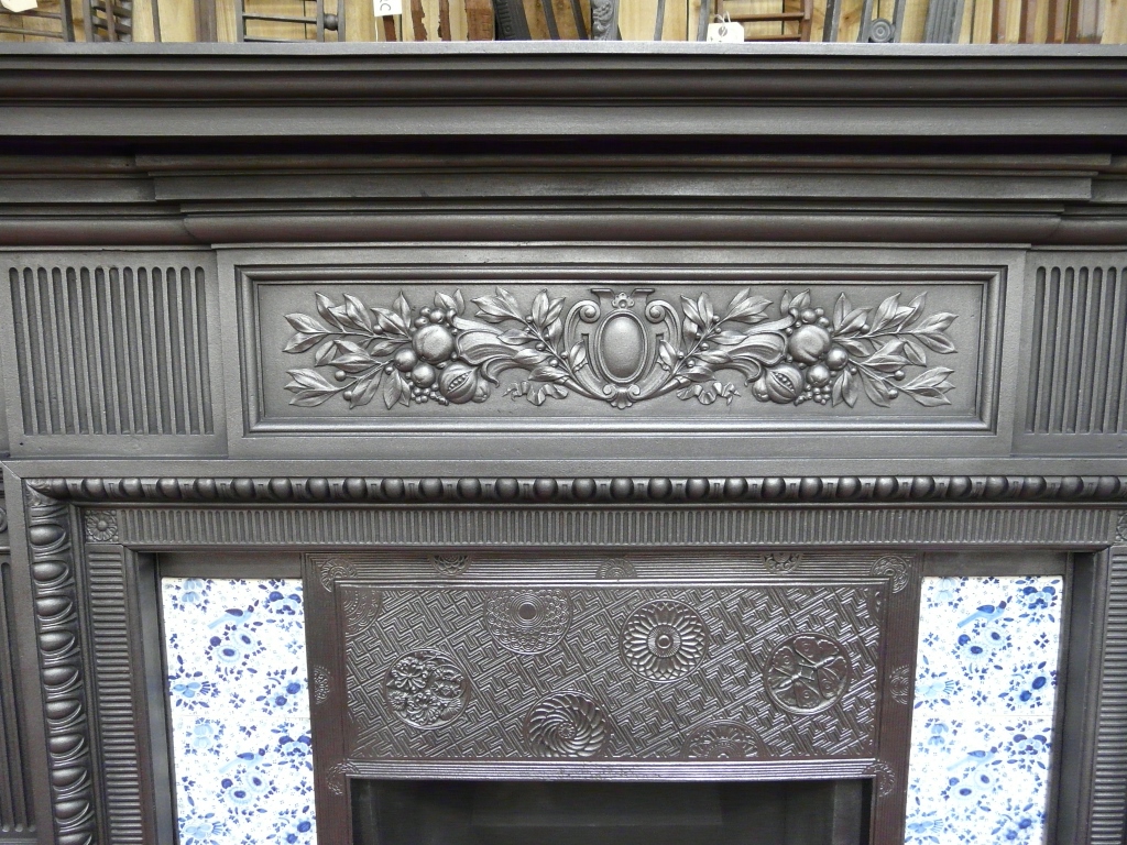 Victorian cast iron fire surround with an Arts & Crafts influence. A central plaque of fruit and foliage and fluted panels surround and decorative egg & dart detail fire opening. In excellent condition. One of three from a large house in Marlybone, London. Circa 1890.
