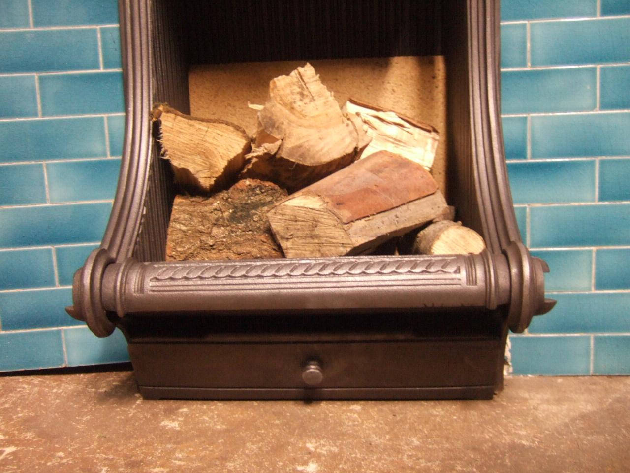 An impressive, original, Art Nouveau insert / canopy on legs. The hood detail comprises of a central heart-shaped leak and outer leaves encompassing seed pods. It has a very large fire box, which is ideal for burning logs. Complete with its original tile panels, which are included in the price. Believed to be from The Earl of Dartmouth's house. In excellent condition. Circa 1905.