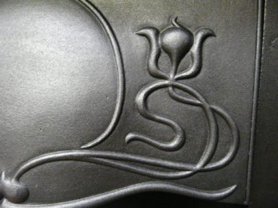 Art Nouveau tiled insert with classic art nouveau stems and flower heads. In good condition, complete with new back and grate. From a house in Coventry.