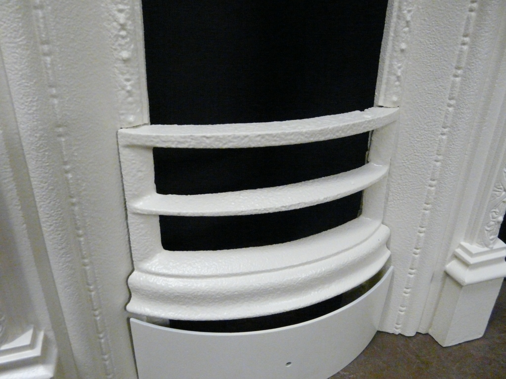 Pretty Victorian bedroom fireplace with half columns decorated with flowers which is repeated on the frieze. Finished in Heirloom White paint. In good condition, complete with new back & grate. From a house in Market Drayton, Shropshire. Circa 1870.