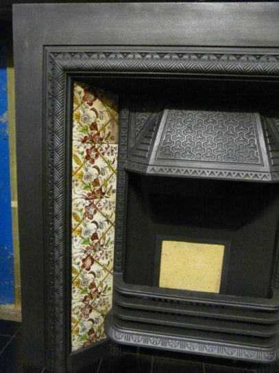Late Victorian tiled insert with geometric patterns. In excellent condition, complete with new back and grate. From a house in Bristol. Circa 1895.