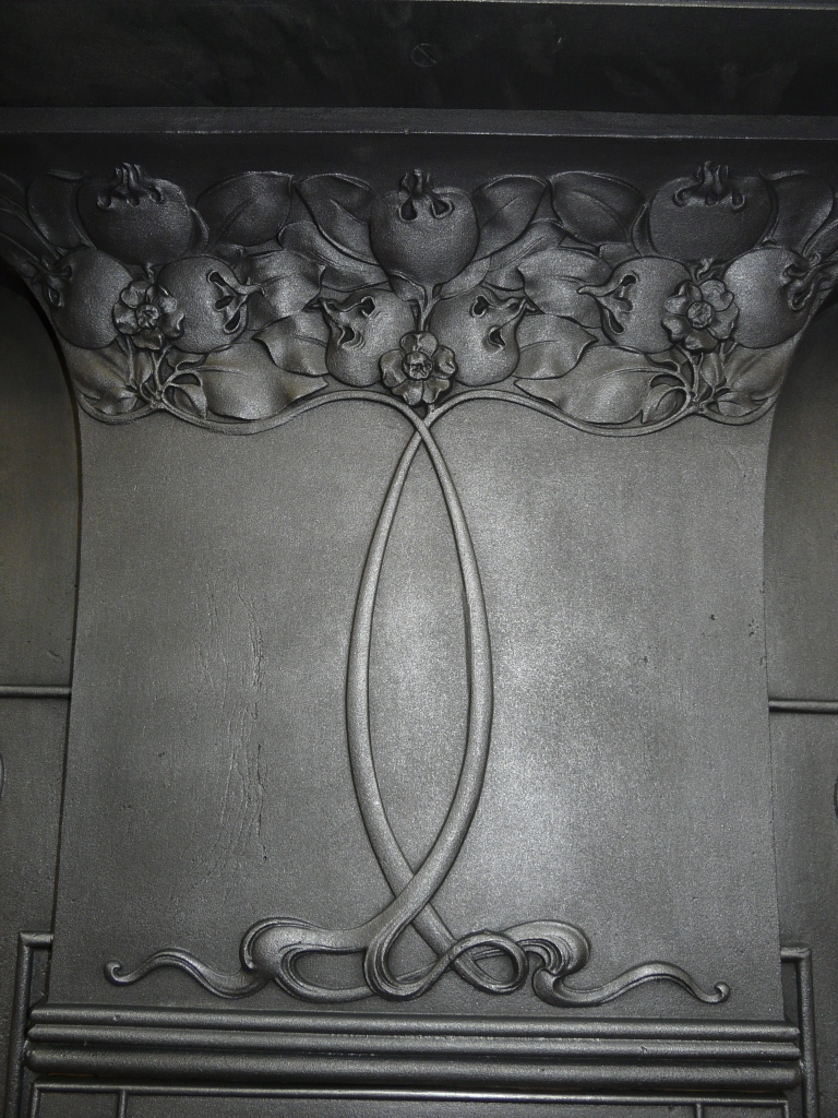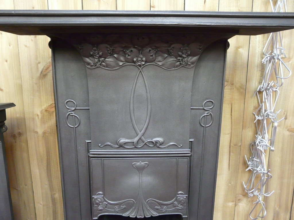 Slender Art Nouveau fireplace with a profusion of flowers and seed pods under the shelf. Sinuous stems and leaves decorate the rest of the fireplace. In excellent condition. From a house in Preston, Lancashire. Circa 1903.