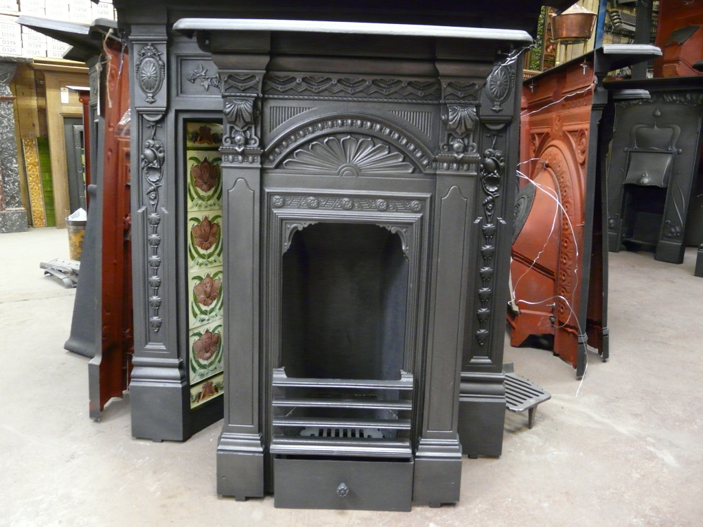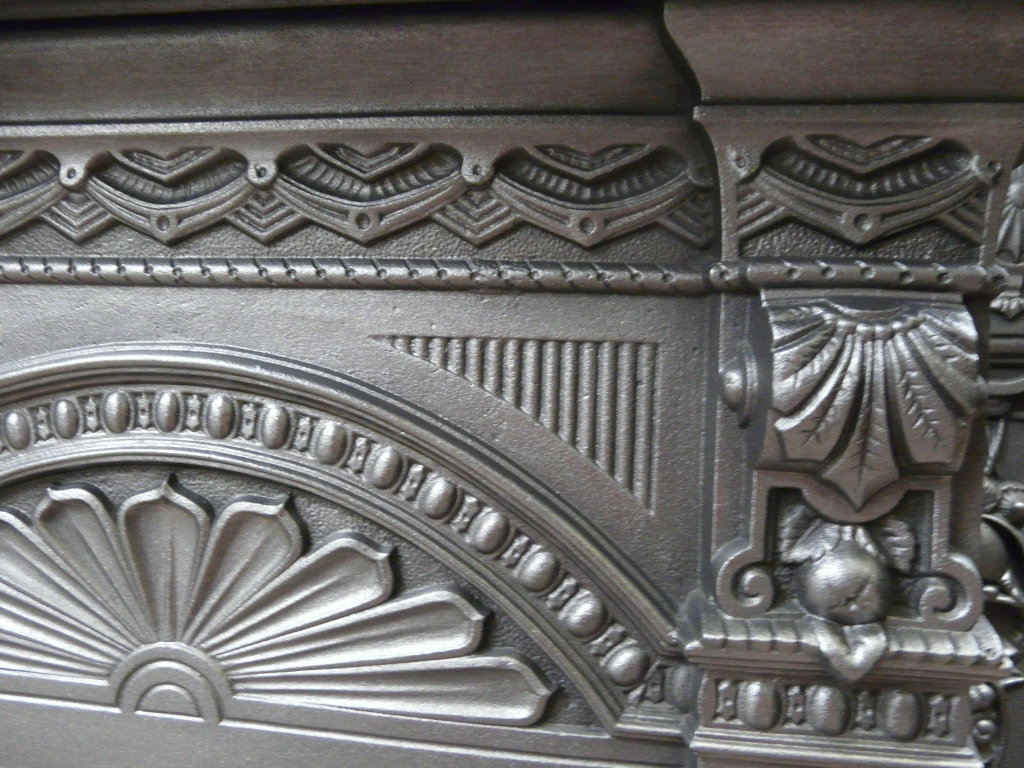 Intricate Victorian bedroom fireplace; a pair of mini-corbels with fruit encompass the frieze, which contains a slow arched fan surrounded by a ribbon of beading. In excellent condition.With a new back and grate. From a house in Halifax. Circa 1889.