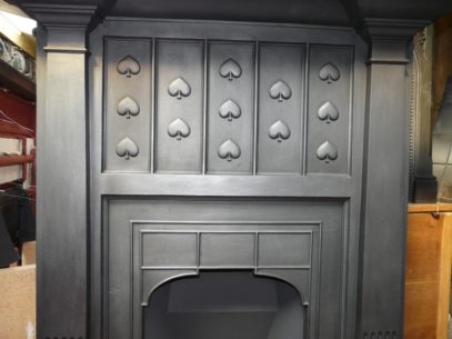 Arts & Crafts cast iron fireplace with a Voysey influence. In excellent condition, complet with new back & grate. From a house in Stockport. Circa 1901.