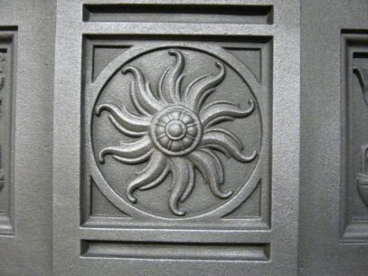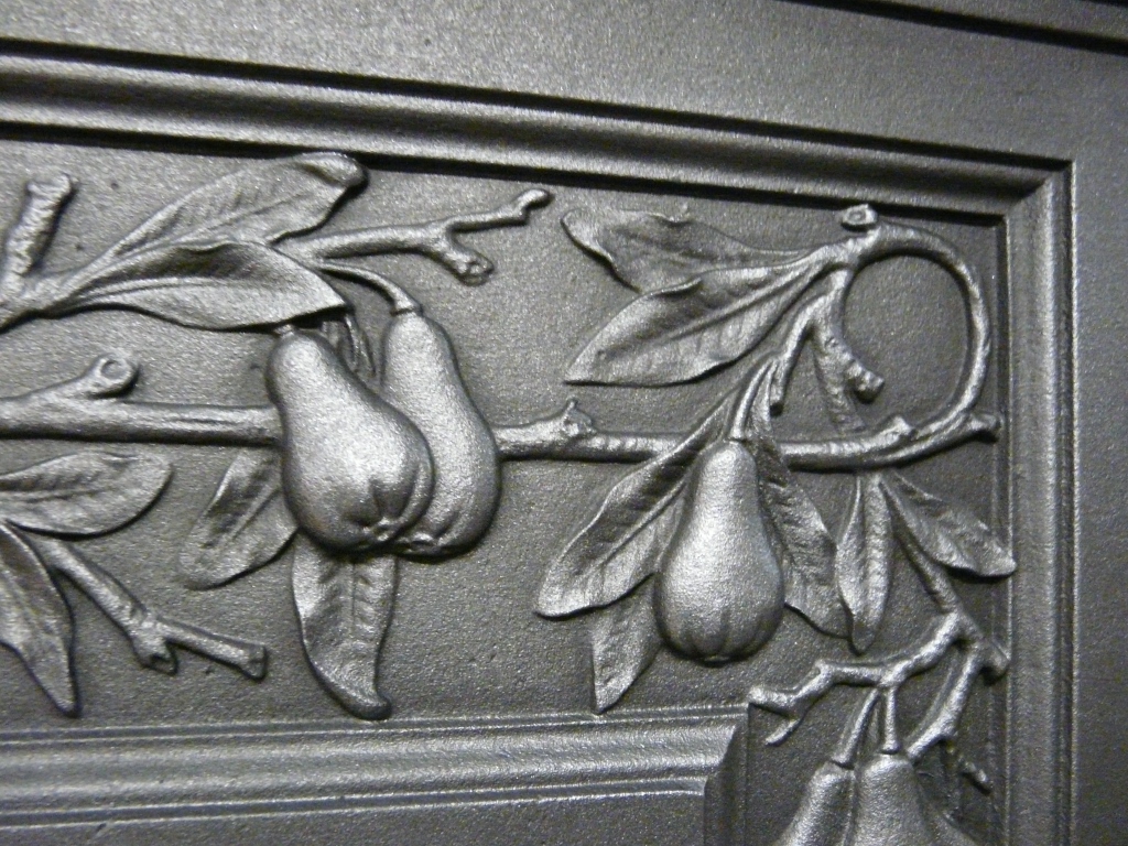 Delightful Victorian fireplace with a central stylised sun and vines of grapes and pears on either side. Tiny acorns decorate the legs. In excellent condition. From a house in Bristol. Circa 1886.