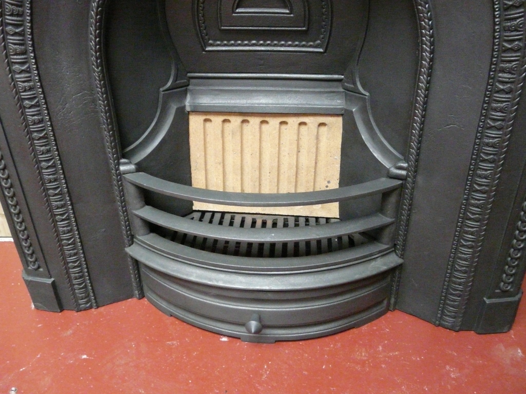 Pretty Victorian fireplace with a decorative arch flanked by spandrils containing foliage and berries detail. In excellent condition, complete with new back and grate. From a house in LLangollen. Circa 1870.