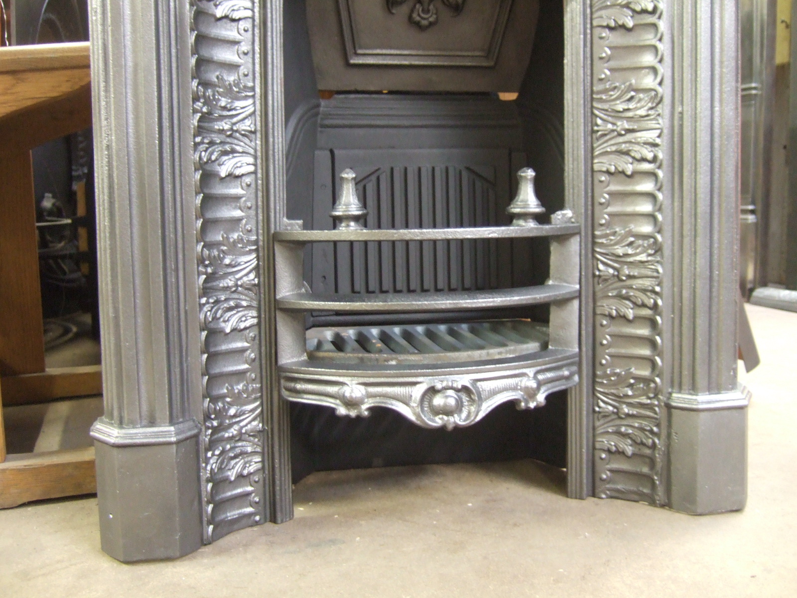 Victorian cast iron bedroom fireplace. In good condition, complete with new back and grate – two options available; cast iron back for decorative use or a clay back for a open fire. From a house in Hackforth, North Yorkshire. Circa 1842.