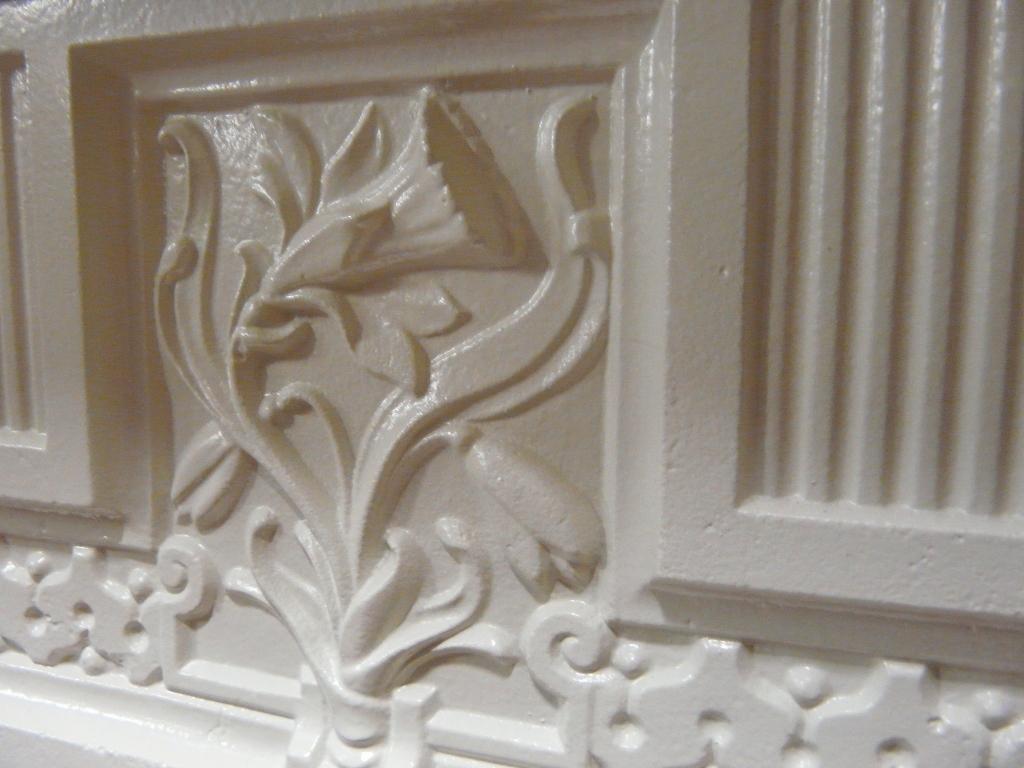 A pretty Arts and Crafts bedroom fireplace with an impressive stylised sunrise on the hood and a single daffodil above. In excellent condition, complete with new back and grate. Finished in Heirloom White paint. From a house in LLandudno. Circa 1895.
