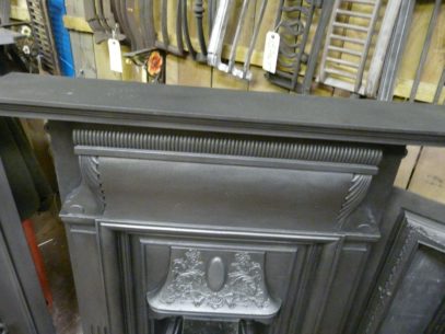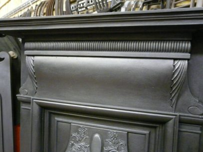 Tall late Victorian cast iron fireplace with a cushion frieze, flute legs and pretty flower & foliage detail to the hood. In excellent condition, from a house in London. Circa 1891.