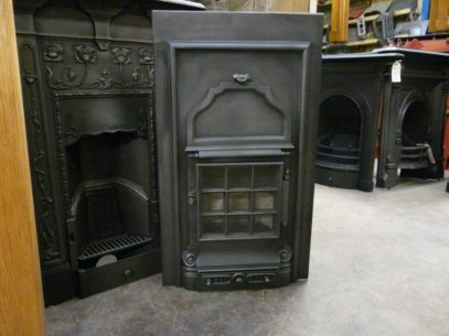 Very unusual cast iron stove inset fireplace from the 1930’s. Designed to fit into the same size opening as a small fireplace. The fire can be isolated by closing the door and the top opens to keep food or an iron hot. The first one we have seen!