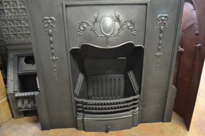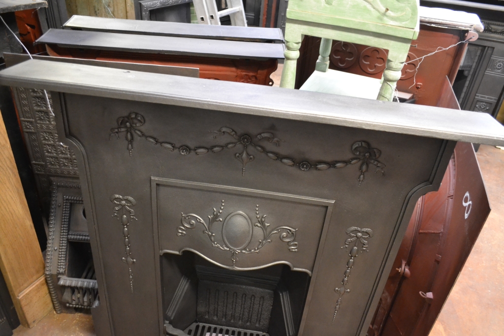 Edwardian cast iron fireplace decorated with swags of bluebells suspended by ribbons. In excellent condition. From a house in Brighton. Circa 1910.