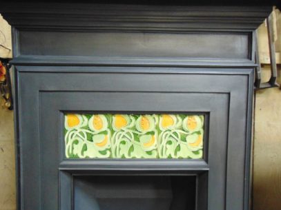 Late Victorian fireplace with pretty Victorian tiles above fire opening. In excellent condition, from a large house in Edgbaston, Birmingham. Good size fire box. Circa 1884.