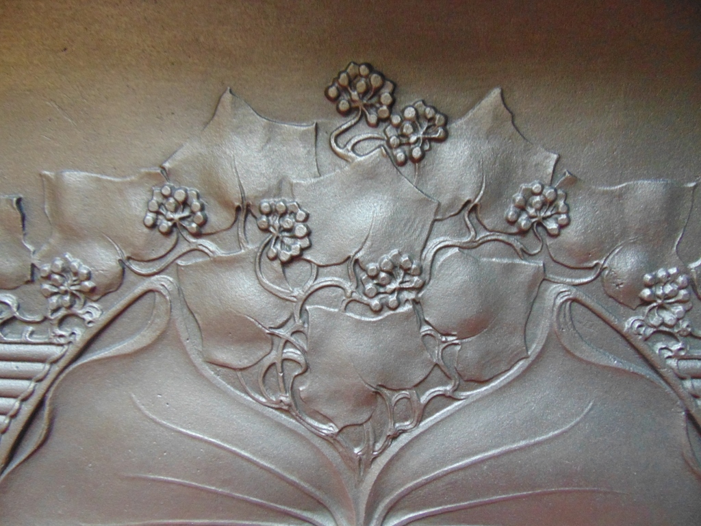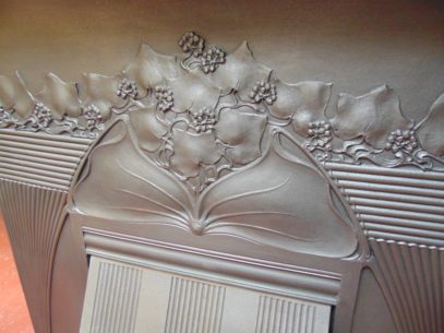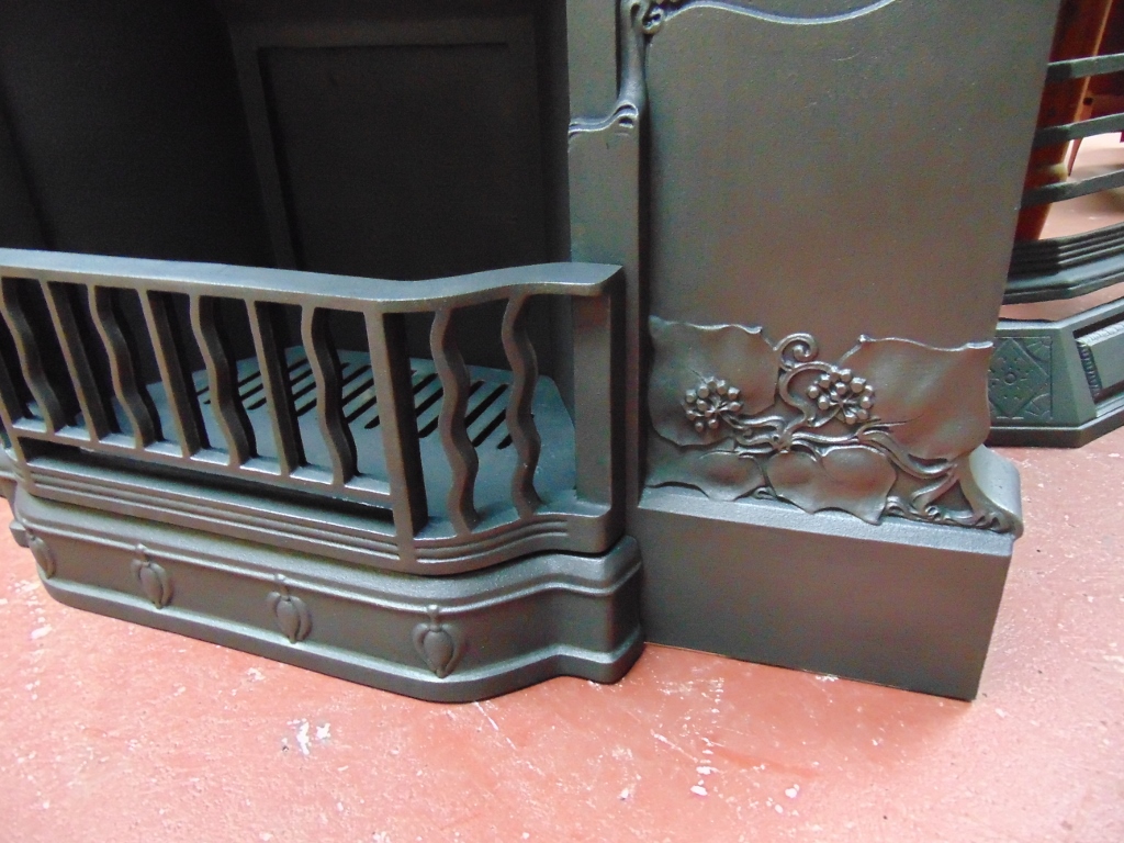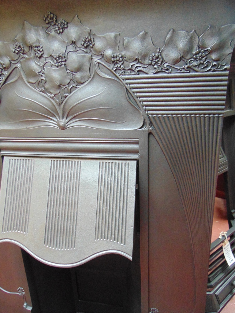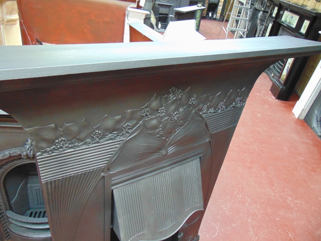 A very distinctive Arts & Crafts fireplace decorated across the frieze in English ivy with berries which is repeated either side the fire bars; amazing attention to detail with the entwined roots. Vertical and horizontal lines, in the Charles Rennie Mackintosh style, converge beside a pair of trumpet shaped flowers.