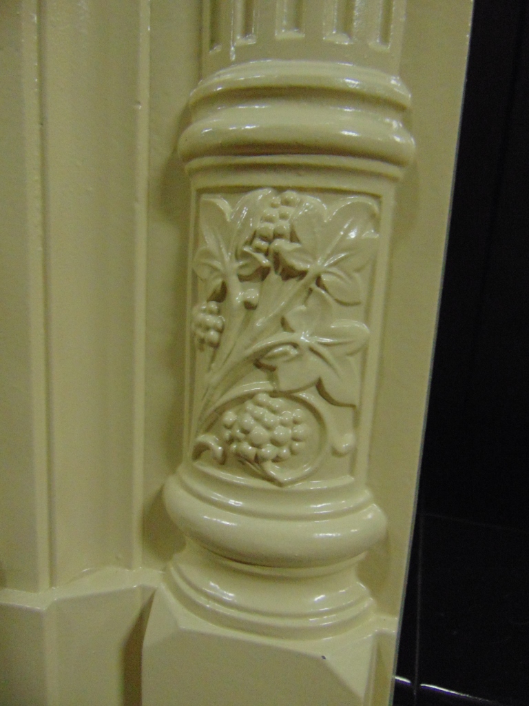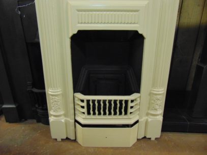 Victorian combination fireplace with half-fluted columns terminating in decorative capitals at the top and in a panel of dog roses and blackberries at the bottom. The frieze has a cartouche flowing with blackberries and brambles. In excellent condition. Finished in antique white. From a house Darlington, Durham. Circa 1896.
