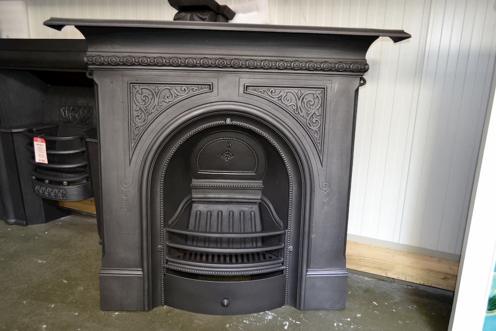 Antique Victorian cast iron fireplace with decorative arch and foliage spandrils. In excellent condition. From a house in West Malling, Kent. Circa 1880