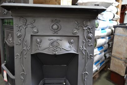 Art Nouveau cast iron bedroom fireplace. Highly decorated with seed pods on sinuous stems.