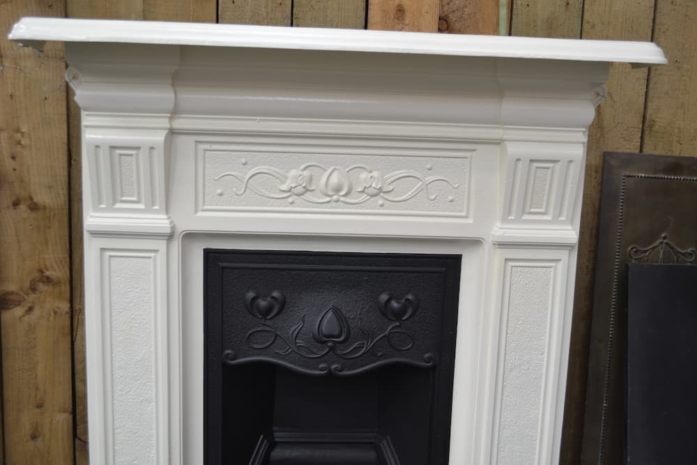 Art Nouveau fireplaces with stylised heart shaped leaves on the hood and pretty flowers on the frieze.