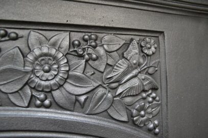 Late Victorian / Arts and Crafts cast iron fireplace designed by Thomas Jeckyll, unusually named “The Milton”. Fabulous detail featuring a bird and butterflies amongst stylised flowers and foliage. In excellent condition.