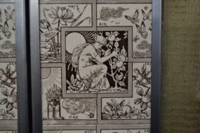 Original Aesthetic Movement tiles; set of ten 6″ x 6″ tiles, cream background with brown detail depicting North, East, West, South on the center two and Water, Air, Earth and Fire on the remaining eight. In excellent condition.