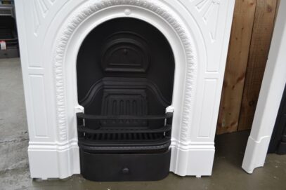 Painted cast iron Victorian fireplace with a pretty arch flanked by a sunburst design spandrils, finished in satin white.
