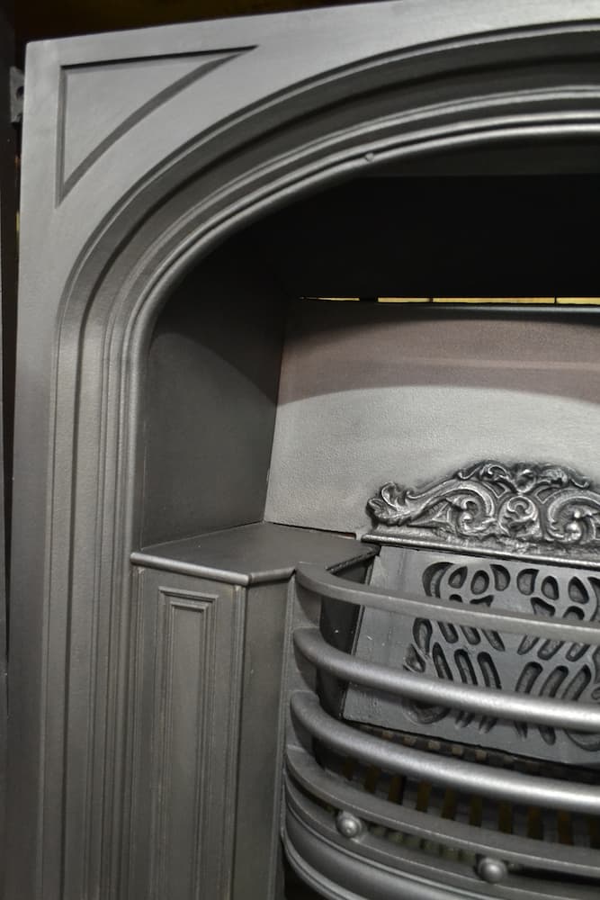 Early Victorian hobgrate with simple panels and a decorative fire back.
