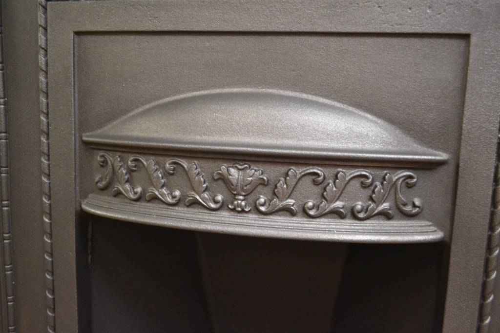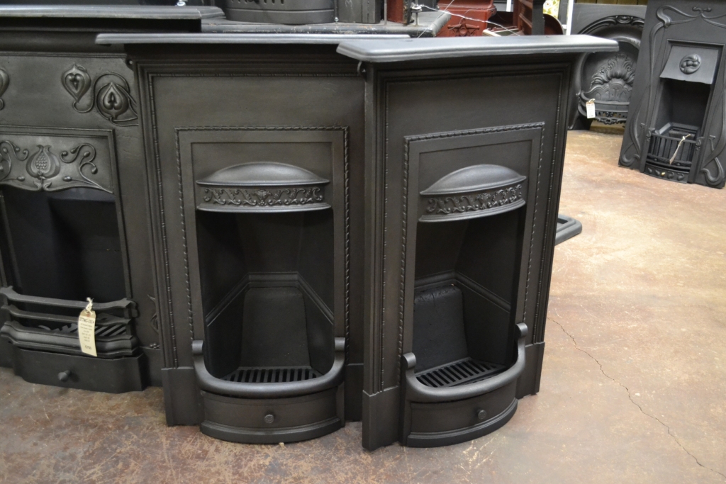 A pair of Edwardian cast iron bedroom fireplaces. Simple design with a band of foliage across the hood. In excellent condition. From a house in Mattock, Derbyshire.