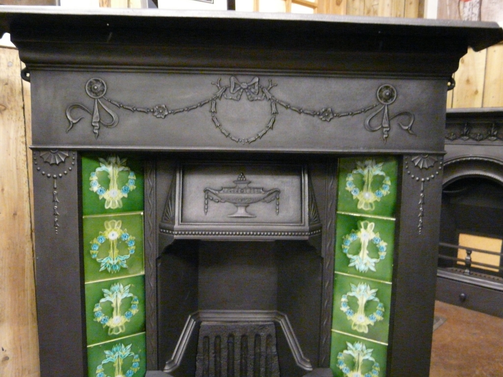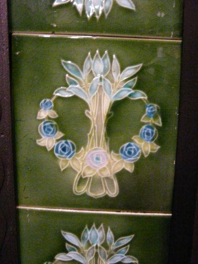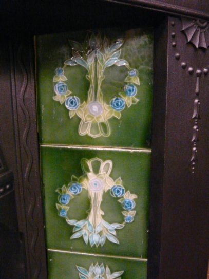 Shown with original Edwardian tiles; green background, blue and white flowers with an Art Nouveau influence. In excellent condition. E025 Available with this fireplace @ £400.
