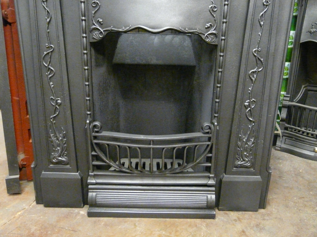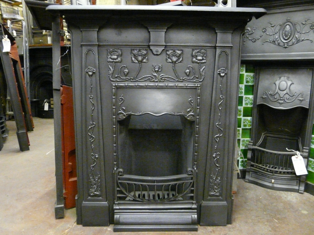 Outstanding Art Nouveau cast iron fireplace with stylised poppies across the frieze. In excellent condition, complete with new back and grate. From a house in Middlesbrough.
