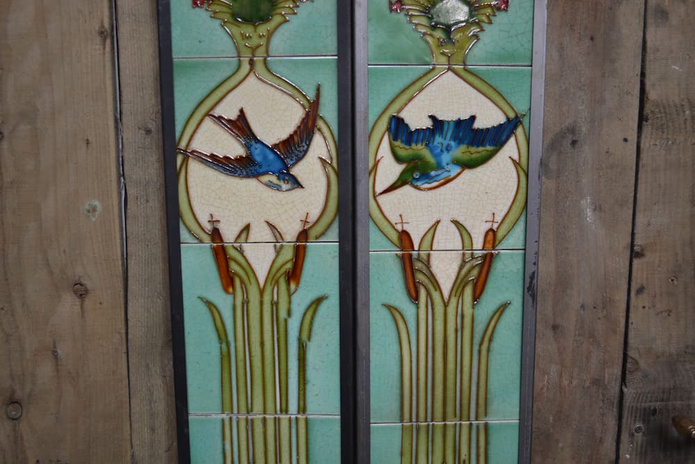 A rare set of original fireplace tiles depicting water lilies on a pond surrounded by bullrushes, a swallow and kingfisher are in flight above.