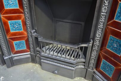 Reclaimed Victorian tiled insert with an intricately detailed hood. Made by the Coalbrookdale Foundry. Complete with original tiles.