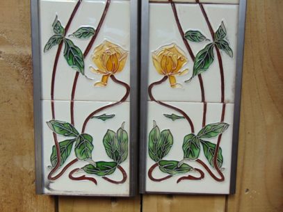 Set of ten 6″ Art Nouveau reproduction tubeline fireplace tiles. Yellow stylised roses on sinuous stems set on an ivory background.