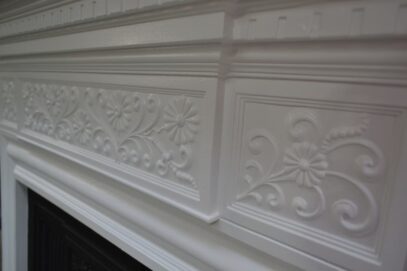 Tall Victorian cast iron fireplace decorated with stylised daisies and foliage. Finished in satin white and black.