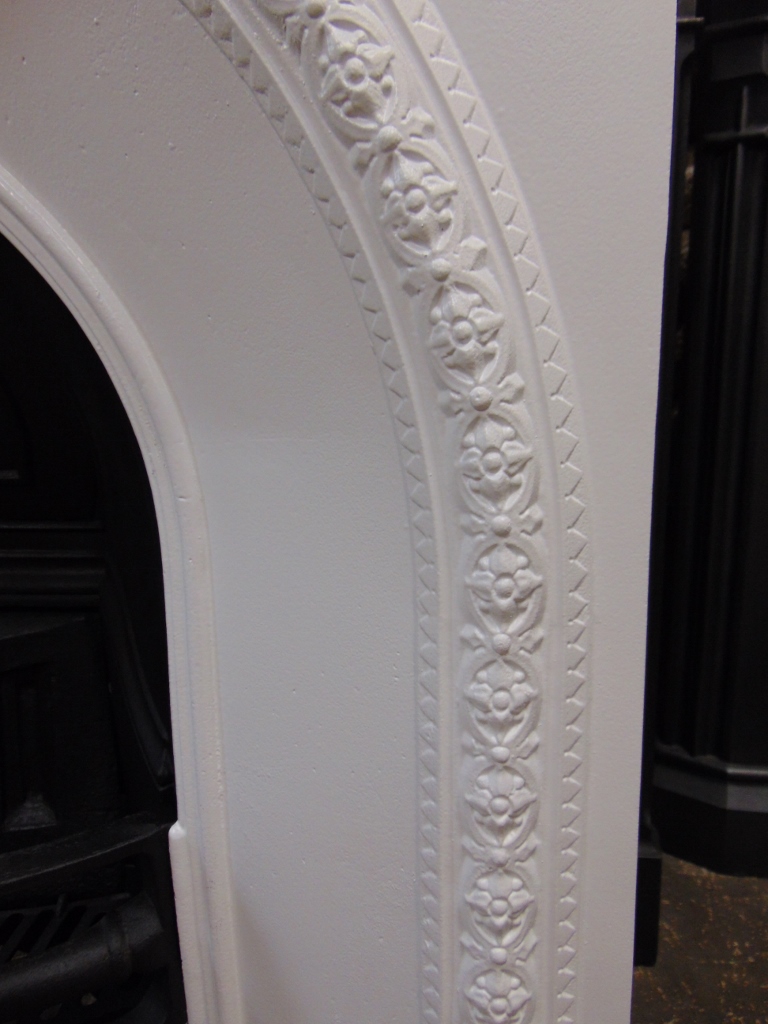 Victorian cast iron arched insert finished in satin white. In good condition. Ornamental or gas fire use only.