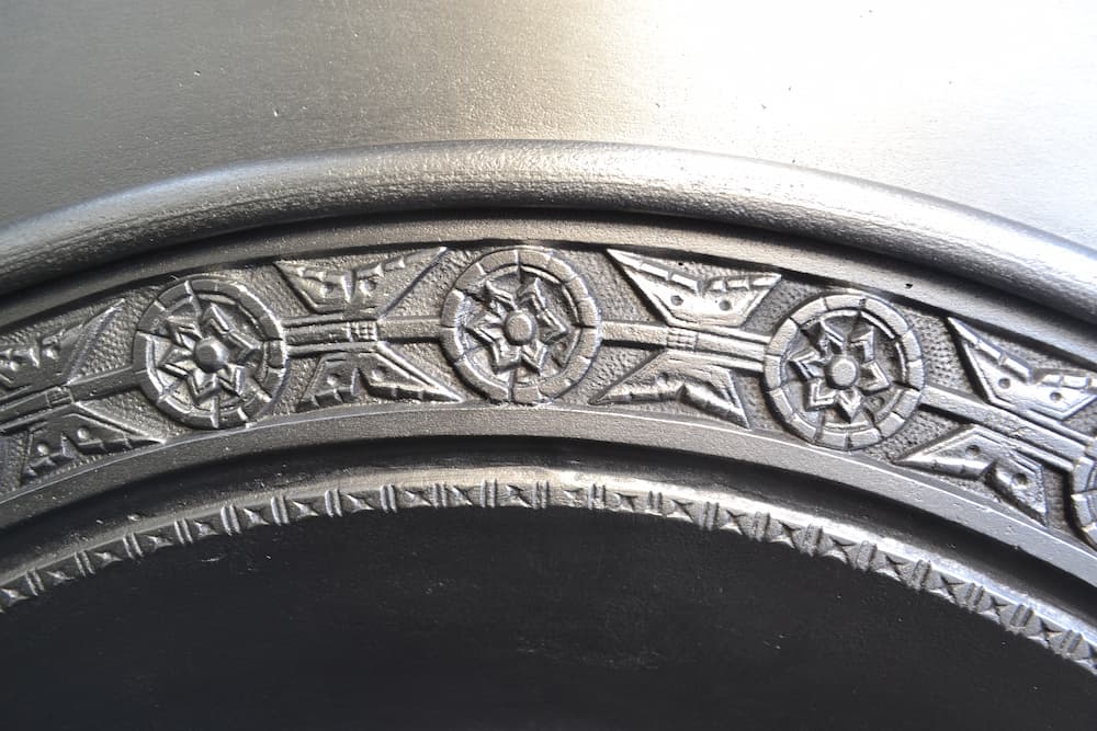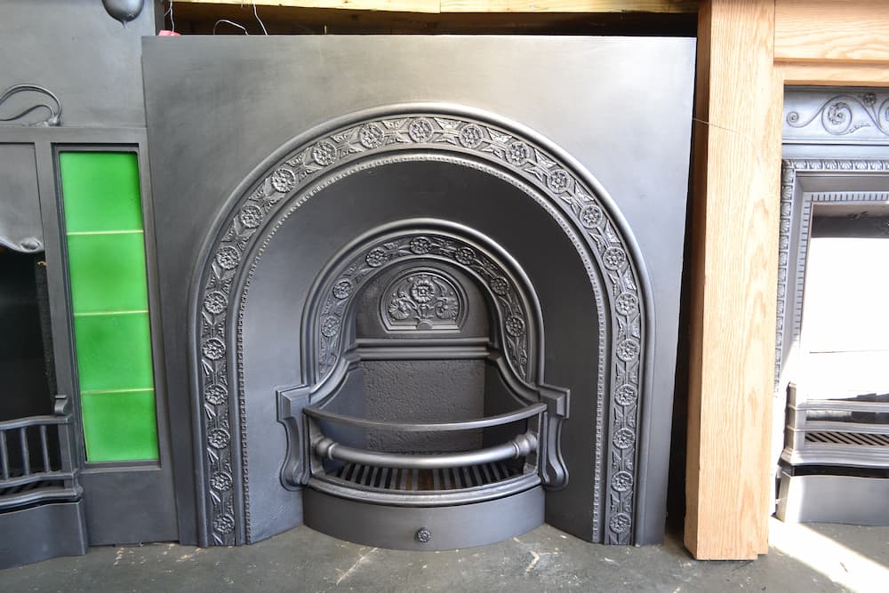 Reclaimed Victorian arched fireplace insert with stylised flowers around the inner and outer arch.