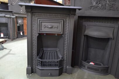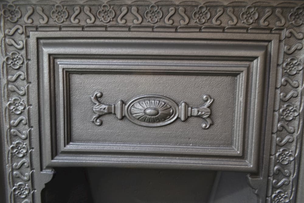Late-Victorian bedroom fireplaces with intricate floral detail around the opening. In good condition, damper plate included but not shown.
