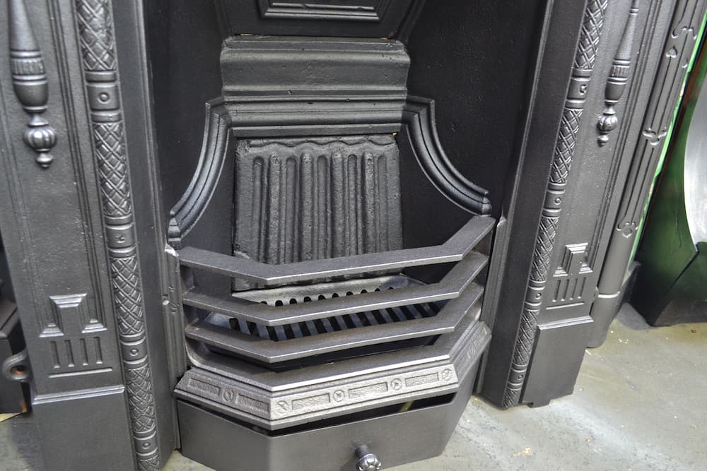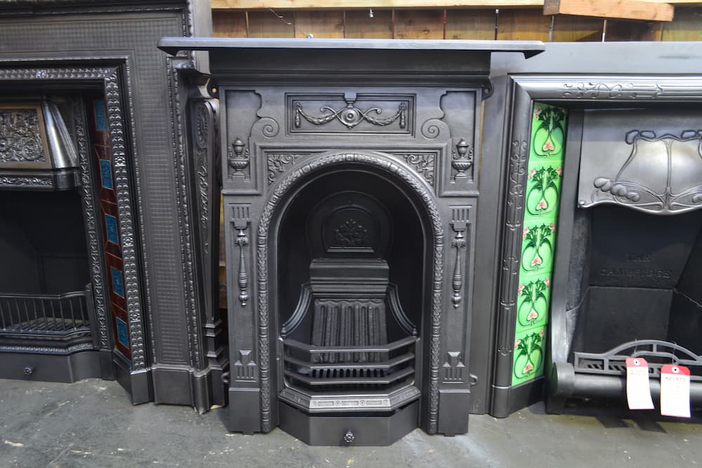 Victorian bedroom cast iron fireplace with an arched opening flanked by urns.