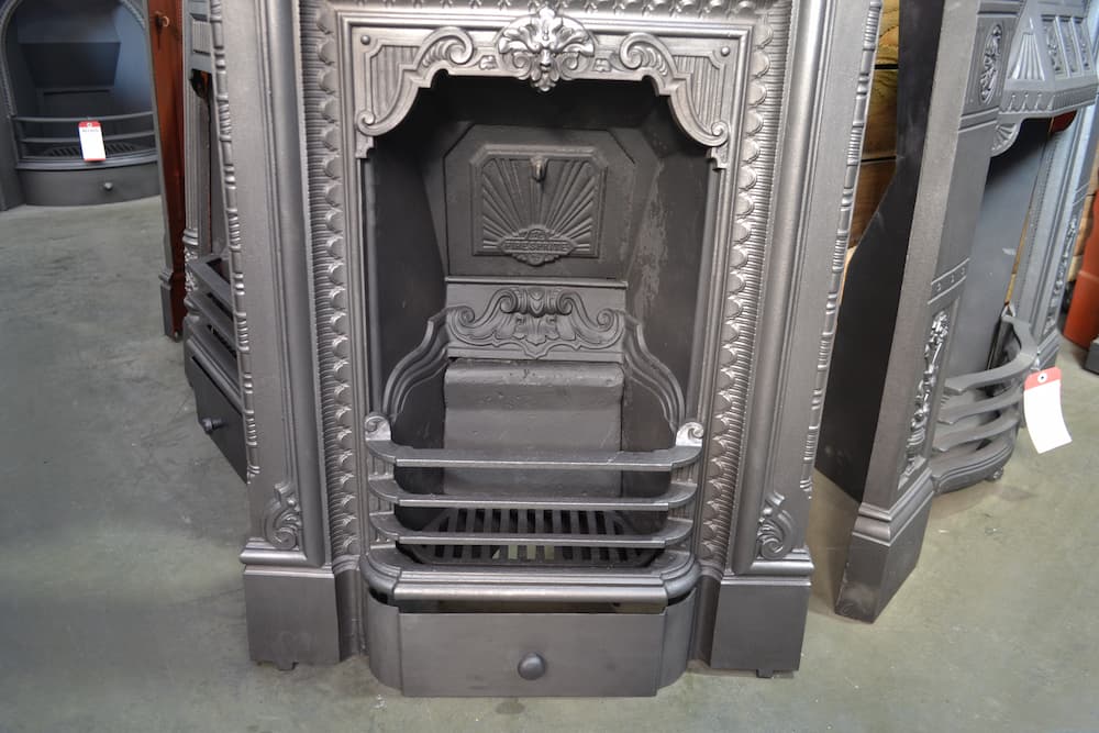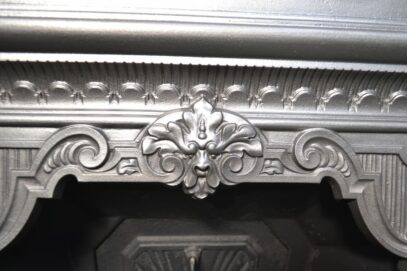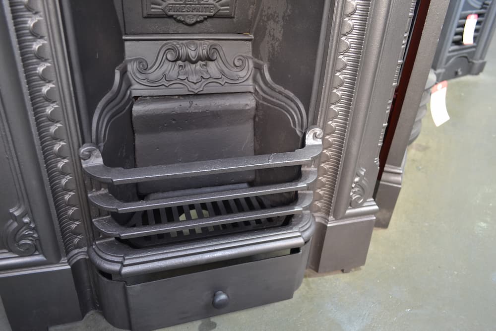 The Fire Sprite, one of a pair of Victorian cast iron bedroom fireplaces from a house in Deganwy, North Wales. Elaborately decorated bedroom fireplaces with the “fire sprite” over the fire opening.