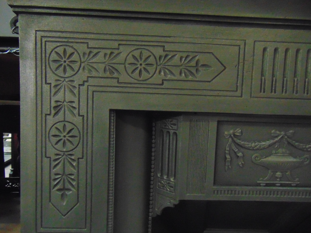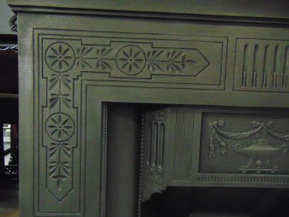 Victorian cast iron fireplace with geometric design and a urn with swags and ribbons to the hood. In excellent condition.