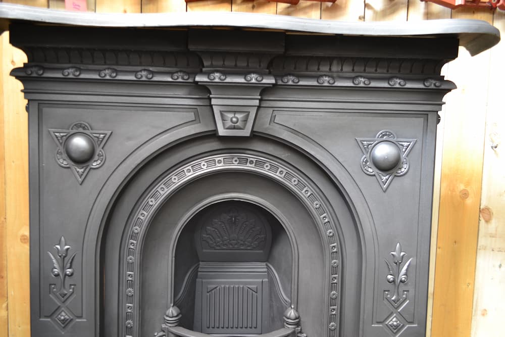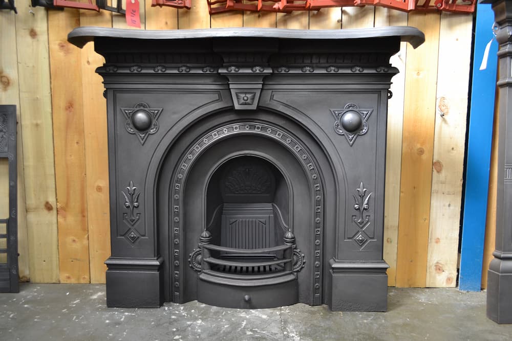 Victorian cast iron fire surround with star shaped bosses to the spandrils. Stylised foliage decorates the bottom of each leg and across the frieze which is topped with a serpentine shelf. Circa 1890