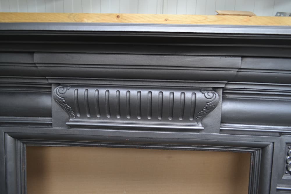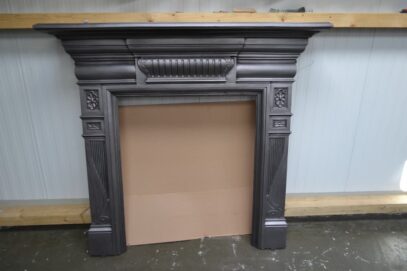 Reclaimed Victorian cast iron fireplace surround with shaped detail to the legs and central decoration.