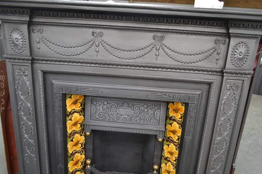 Late Victorian cast iron fire surround with berry bead and foliage chains suspended by ribbons.