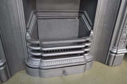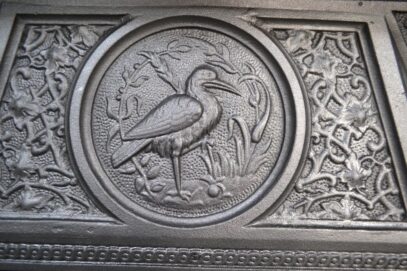 Victorian cast iron fireplace with an abundance of detail including a heron on the hood.