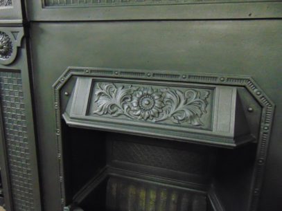 Late Victorian cast iron fireplace with chequered panels and a pretty flower to the hood. In excellent condition. From a house in Hoylake, Wirral. Circa 1890.