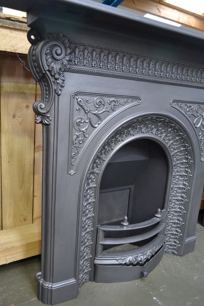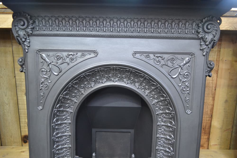 Victorian cast iron fireplace with a highly decorative arch and spandrils, spiralled acanthus leaves decorate the fireplace edge.