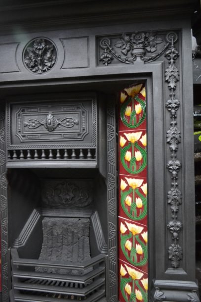 Victorian Primrose tiled combination fireplace made by the Biclam Foundry, with Primroses and an abundance of floral detail and well defined oak leaves on the hood. From a house in Nottingham.