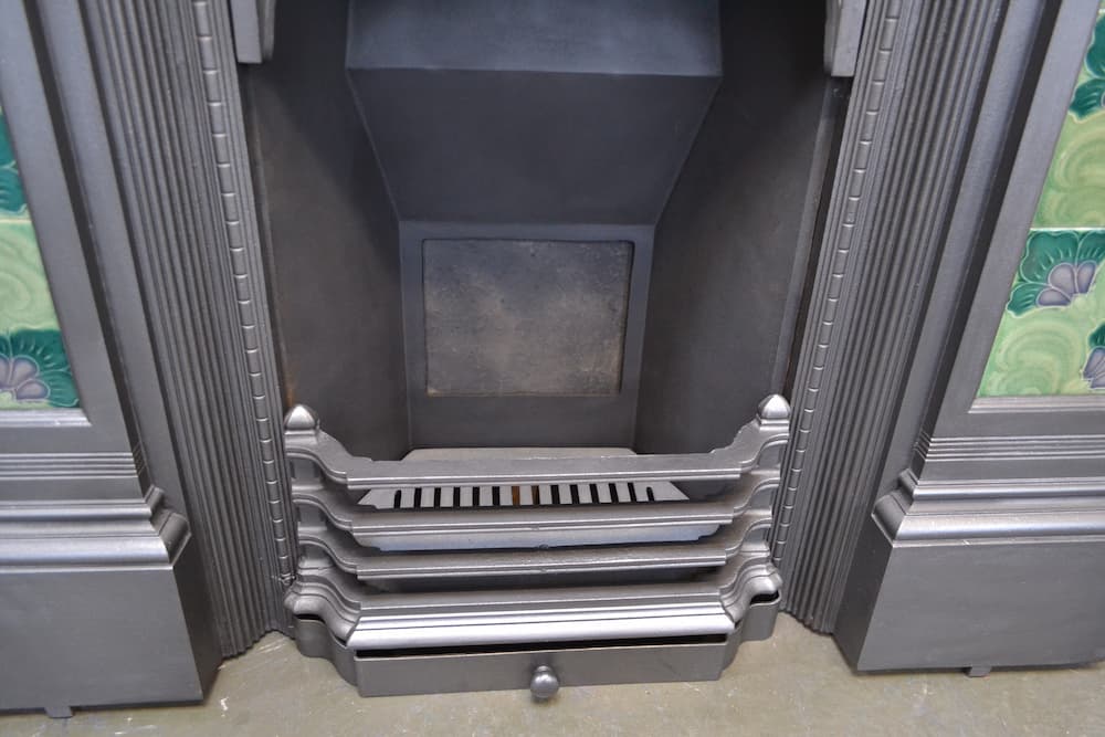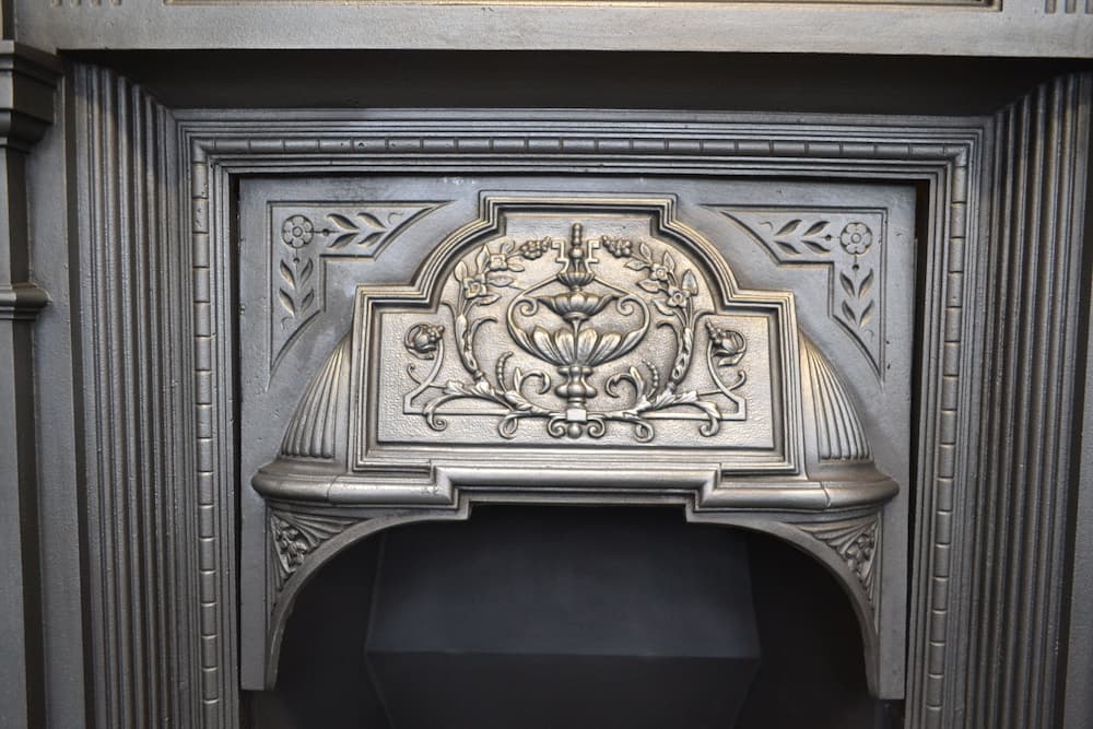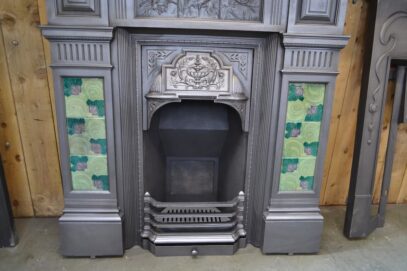 A Victorian cast iron fireplace with central panel depicting from left to right; a swallow roosting on a branch below a crescent moon and starry sky. In the centre, a heron wading in a pond, surrounded by wild flowers and reeds. On the right, a wren settling down on an oak branch amongst wild grass.