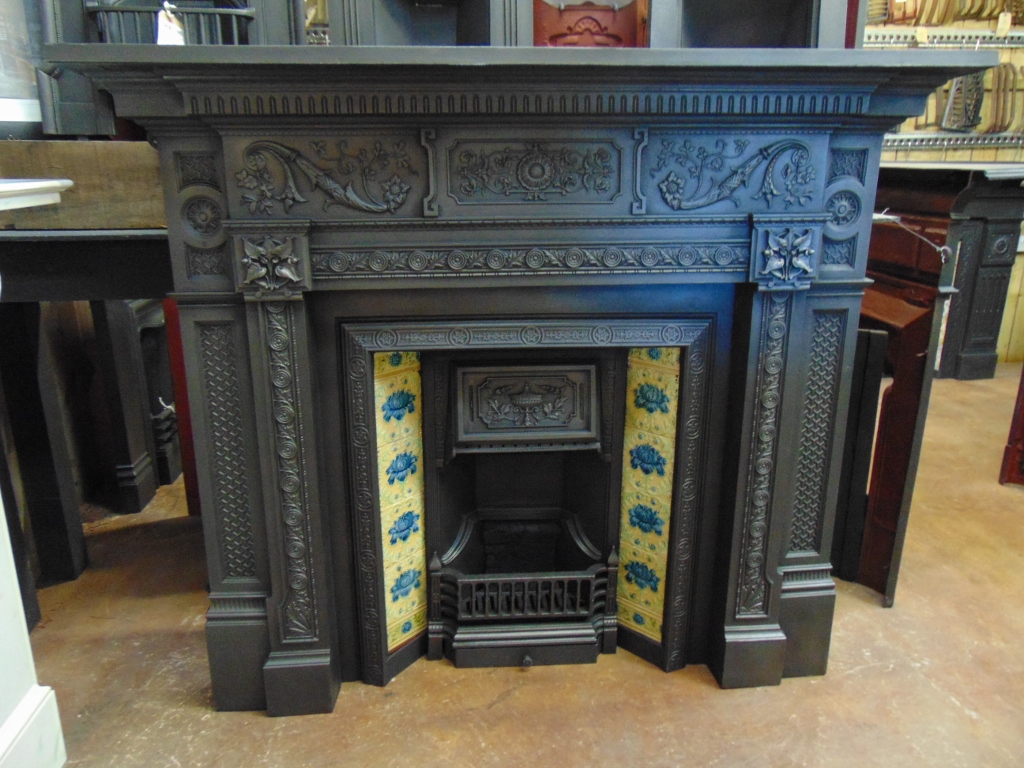 Shown with Antique Victorian Tiles; blue flowers with green foliage on a yellow background. Set made up of 8 6″ x 6″ tiles and 4 3″ x 6″ spacer tiles. All in excellent condition. V092 Available with this fireplace @ £500