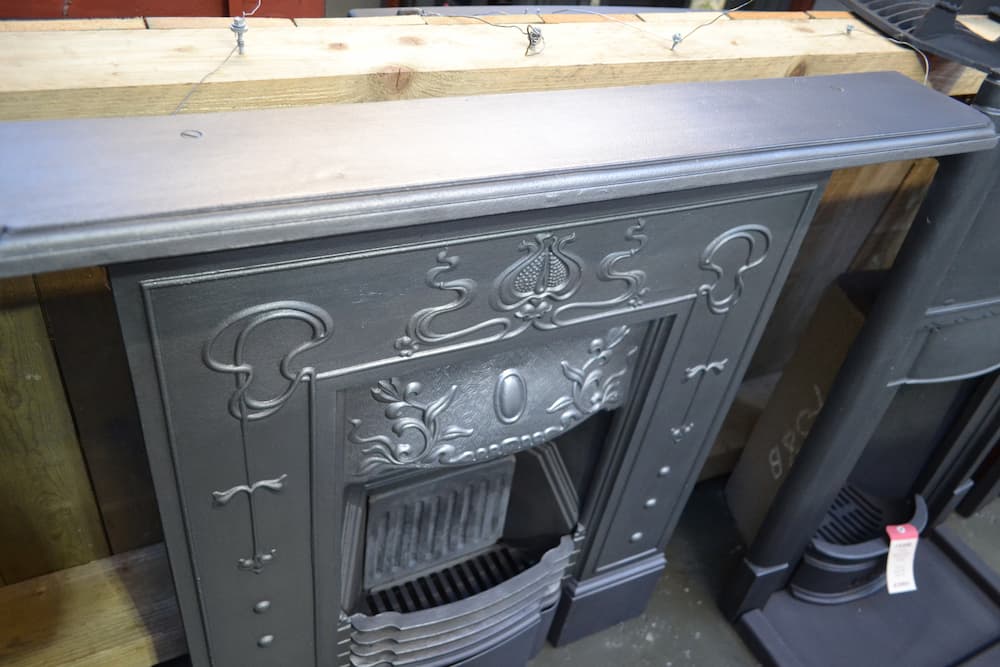 Vintage Art Nouveau cast iron combination fireplace with classic stylised seed pod decoration surrounded by flowing tendrils.